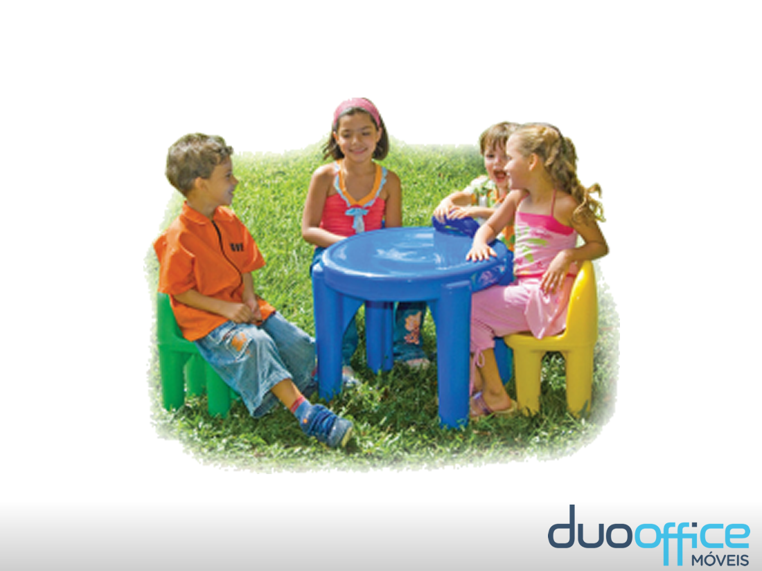 Mesa infantil confeccionada em resina plástica de polietileno rotomoldado. Redonda em diversas cores.